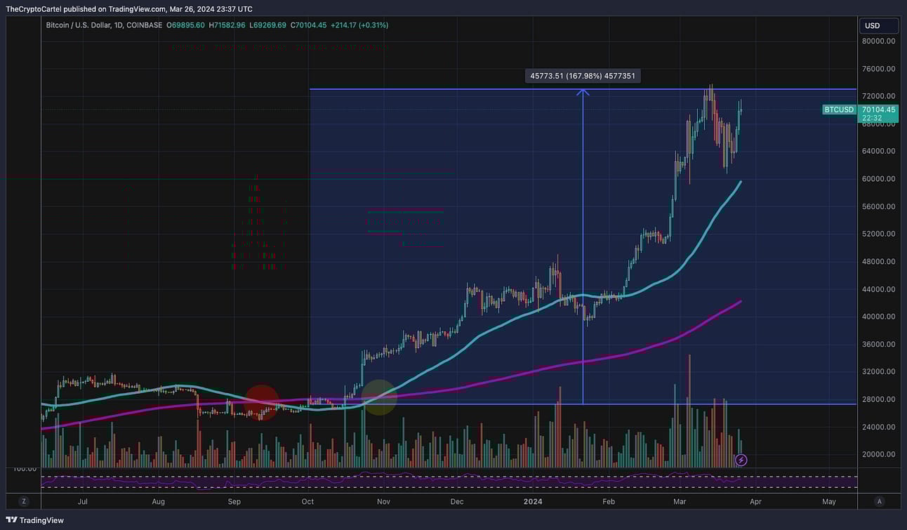 IF you were a member of the crypto cartel - you just may have taken this opportunity to join the latest bull run - BTC ran from here up until a high of $73,000 so far - more than 160%!
